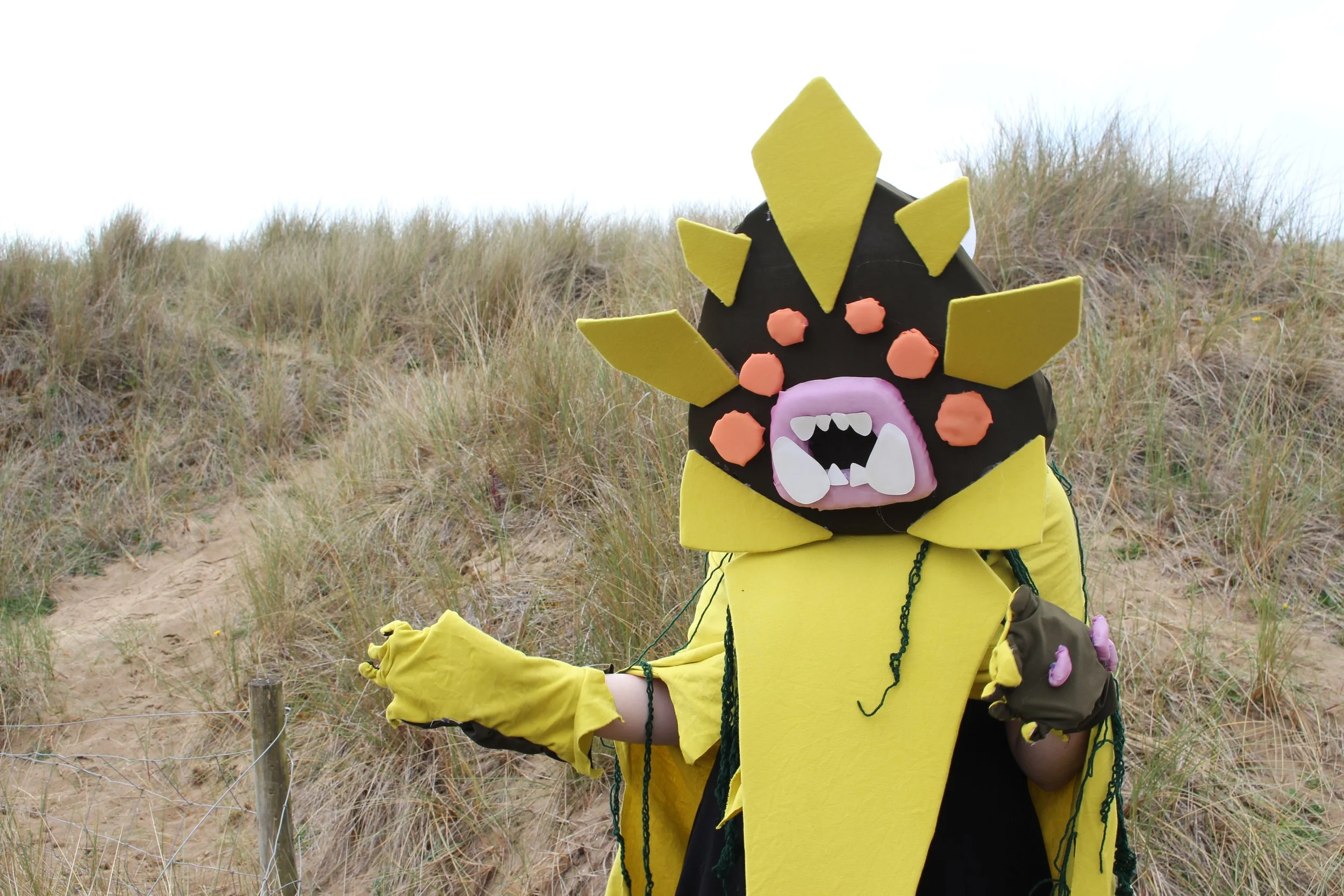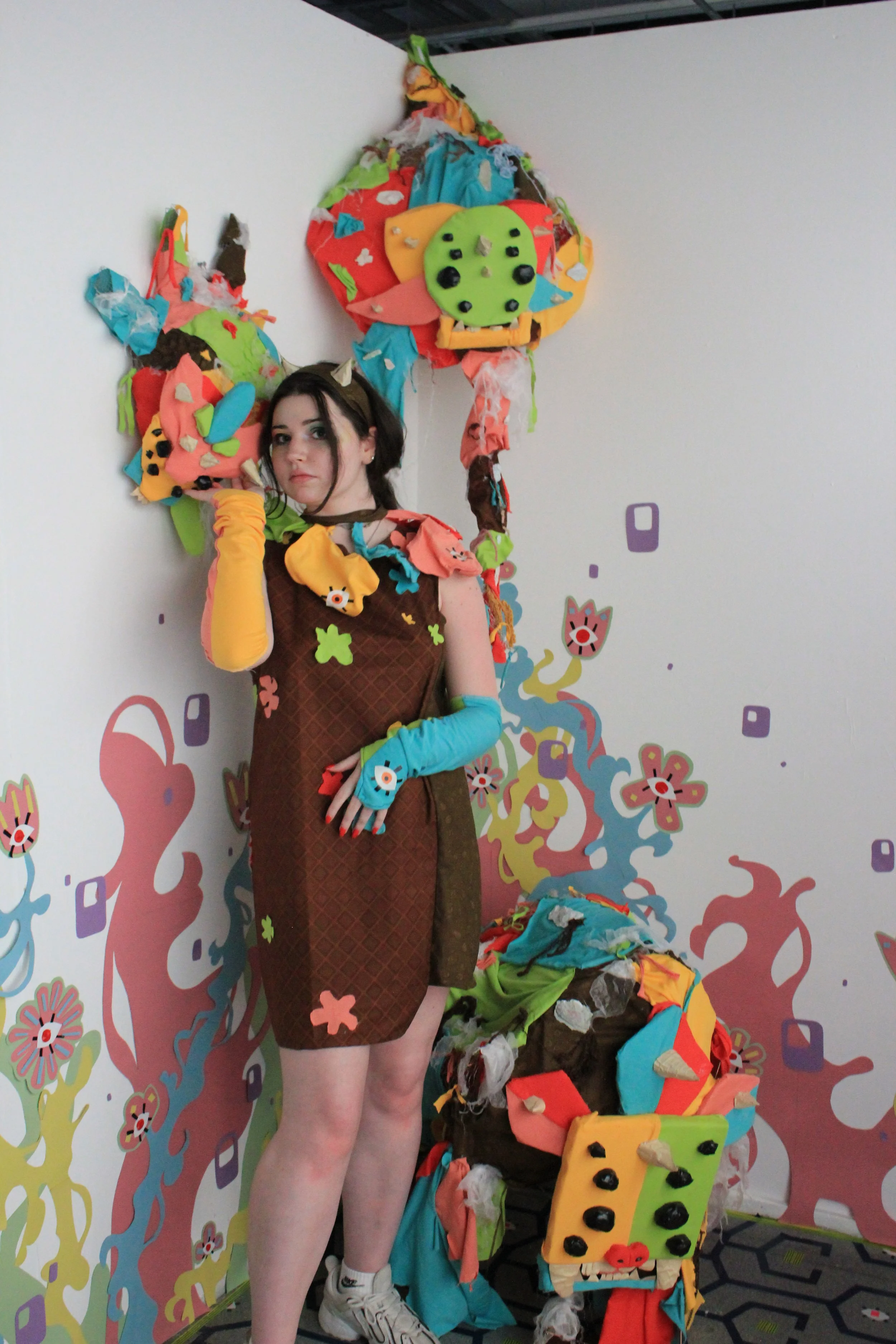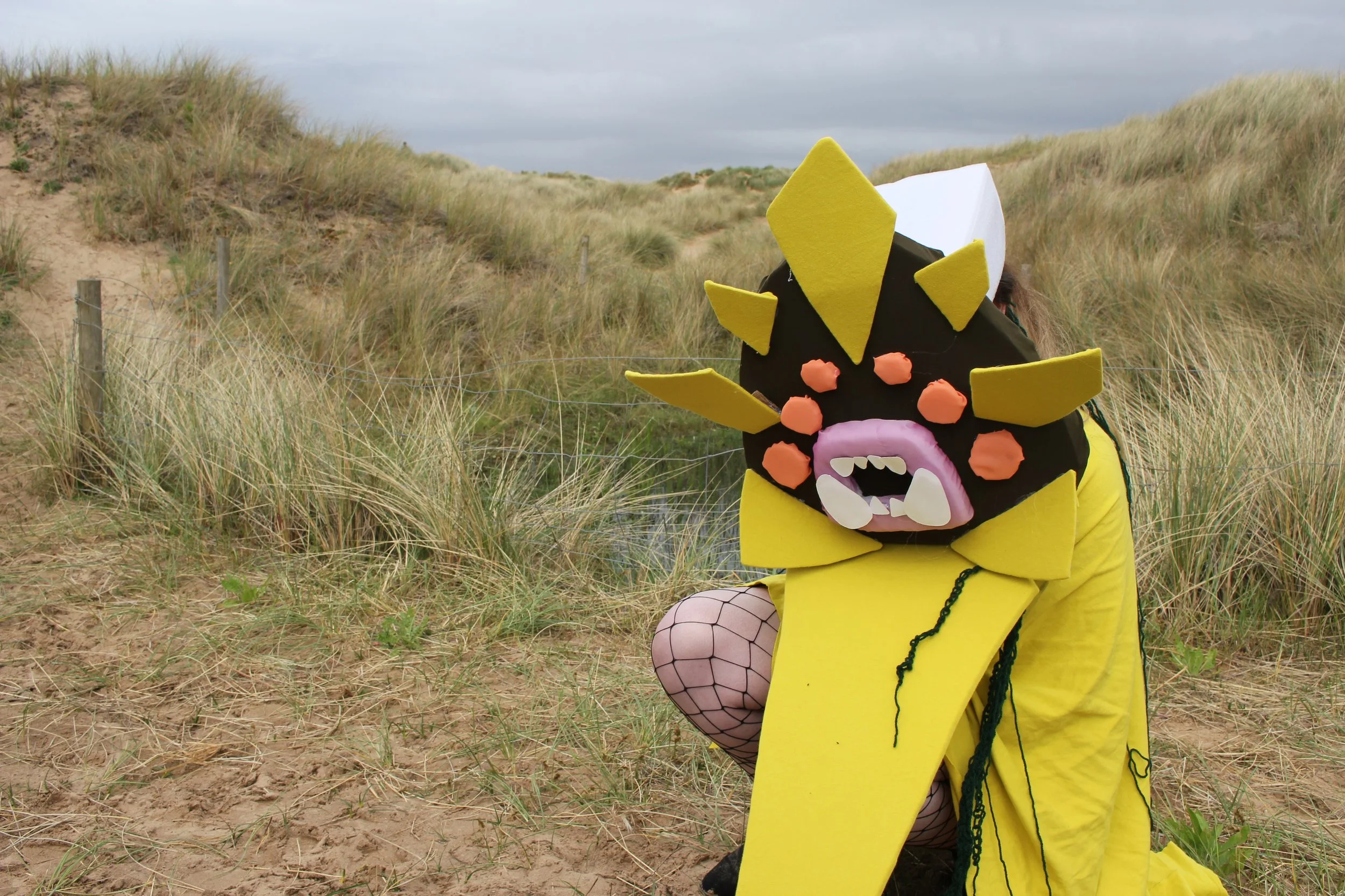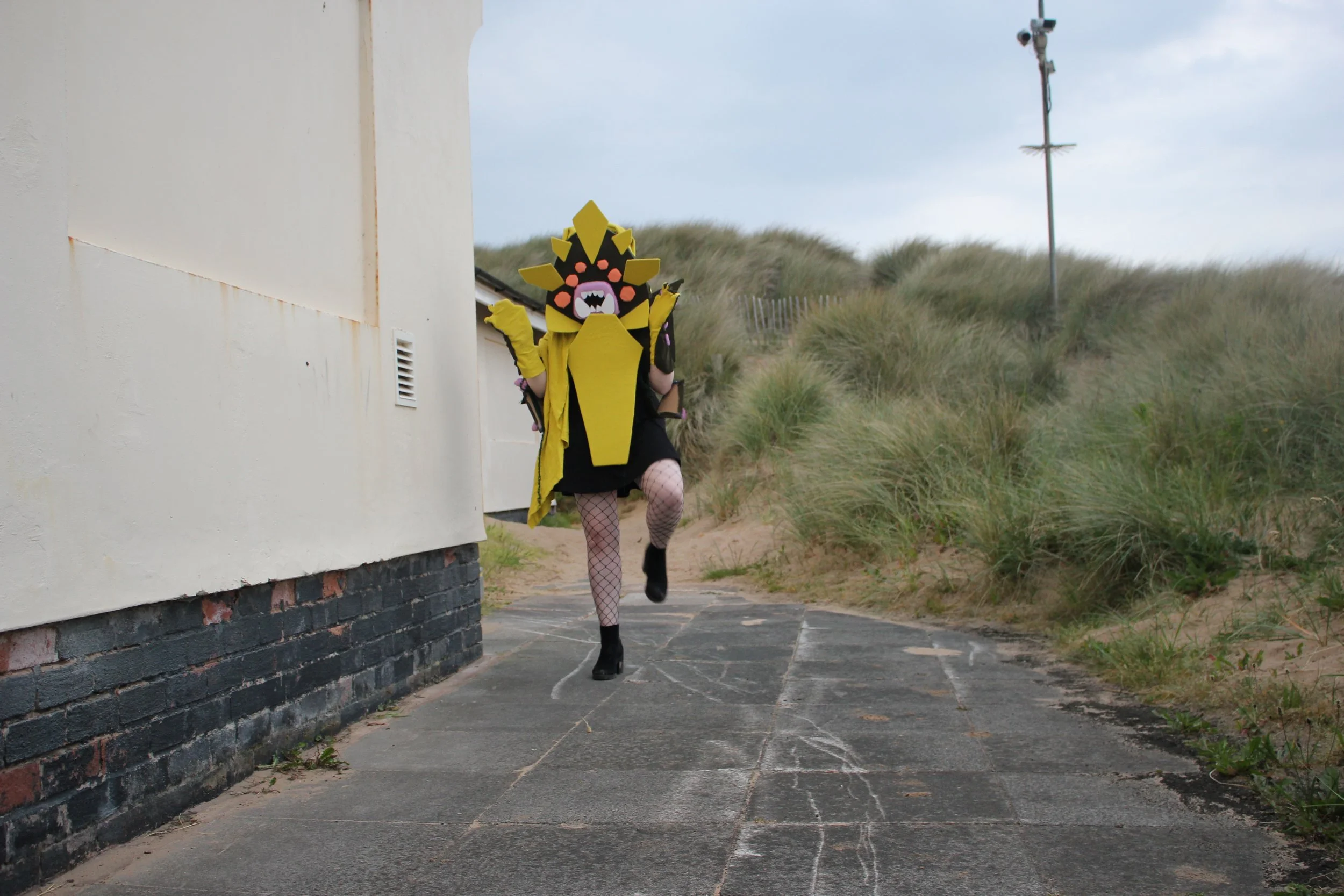 This was my final major project in Art Foundation. The main inspiration for this project was 60s and 70s retrofuturism as well as Japanese ‘tokusatsu’ shows from the 80s. The costumes I produced during this project were made with both standard and unconventional materials including knit, cotton, elastane, foam, cardboard and foil. I also used metalwork to create textile aliens for the final exhibition and vinyl electrical tape to create patterns on the floors.